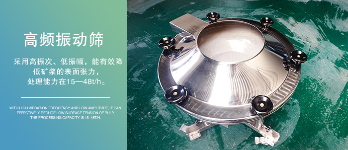 高頻振動篩采用高振次、低振幅,能有效降低礦漿的表面張力,有利于細、重物料的析離分層而加快細、重物料透篩入料濃度在30%—40%,處理能力在15—48t/h。
