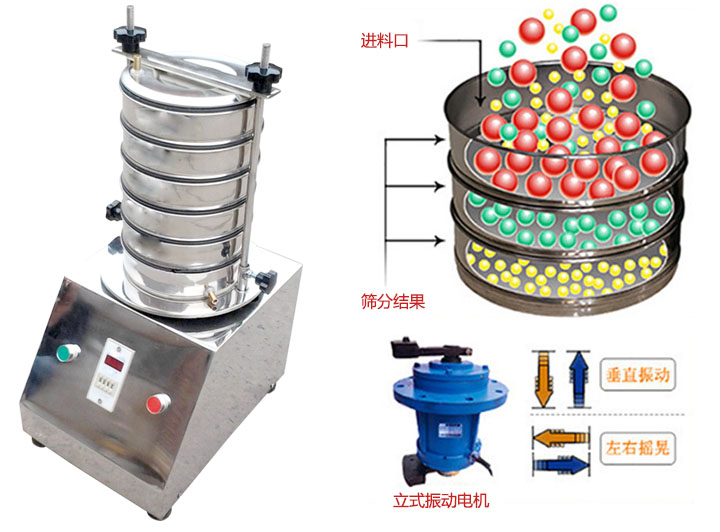 準(zhǔn)試驗(yàn)篩是以YZU立式振動(dòng)電機(jī)作為整機(jī)振動(dòng)源,通過振動(dòng)電機(jī)帶動(dòng)上部振動(dòng)盤振動(dòng),再通過振動(dòng)盤傳導(dǎo)至安放在振動(dòng)盤上部Φ200篩框上,然后由需要檢測(cè)目數(shù)的篩框把小于篩面網(wǎng)孔的物料顆粒篩分至下層篩框,如此層層篩選,使每層試驗(yàn)篩內(nèi)只留相同粒度的物料,達(dá)到不同粒度的分離并確定此物料的粒度組成,使Φ200型篩框中的物料能非常有效的起到過濾、分級(jí)、篩分目的。