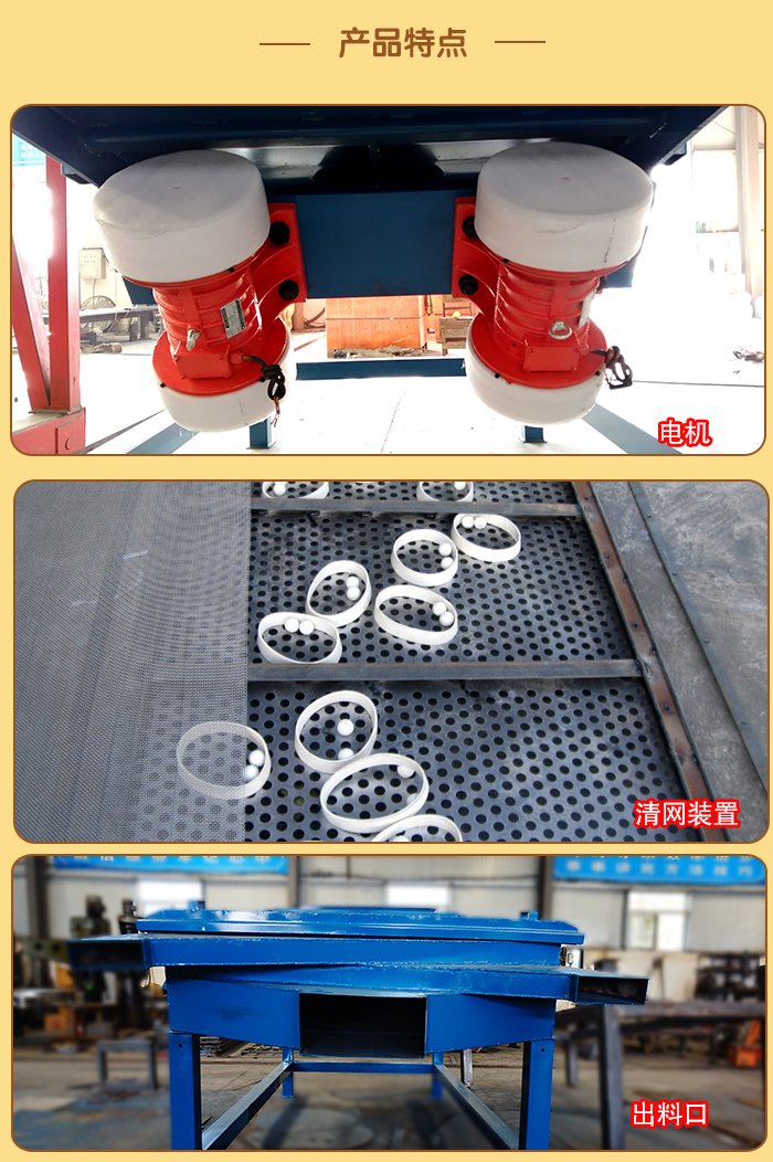 5、電機(jī)臺(tái)座:安裝振動(dòng)電機(jī),使用前連接螺釘必須擰緊,特別是新篩機(jī)試用前三天、必須反復(fù)緊固,以免松動(dòng)造成事故。