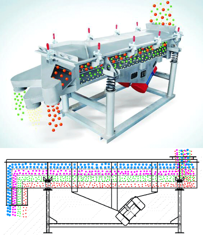 多層直線振動篩利用雙臺電機(jī)作為振動源,物料在篩網(wǎng)上受激振力的作用被拋起,同時向前做直線運(yùn)動,物料從給料機(jī)均勻地進(jìn)入直線篩進(jìn)料口后,通過多層篩網(wǎng)產(chǎn)生了數(shù)種不同規(guī)格的篩上物、篩下午,后分別又從各自的出口排出。