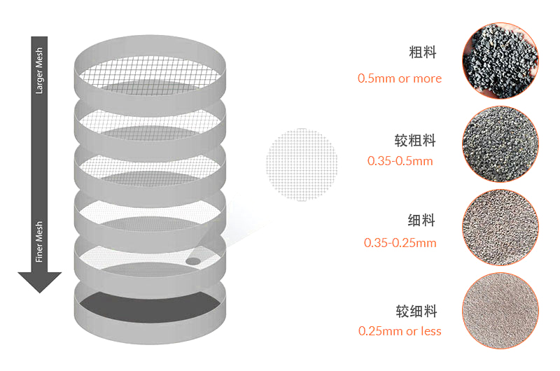 人工手篩費(fèi)時(shí),勞動(dòng)強(qiáng)度大,"機(jī)械篩分"將篩子按孔徑大小疊在一起,給料放在上面一層篩子上,并加上蓋和底盤,一般疊5-6個(gè)篩子,然后放在實(shí)驗(yàn)室振動(dòng)篩上進(jìn)行機(jī)械振動(dòng)篩分。通常振動(dòng)時(shí)間為20分鐘,檢測(cè)篩分質(zhì)量時(shí),再用篩機(jī)5分鐘,如每分鐘篩下量小0.2%試驗(yàn)樣量即為合格,對(duì)于粗粒,過篩率小于1%即可。為避免損失和延長篩分時(shí)間,有時(shí)在開始篩分時(shí)先用較細(xì)的篩子將粉塵篩除。