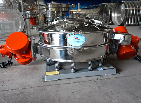 直排篩利用振動(dòng)電機(jī)利用其軸上下端的兩組偏心塊(不平衡偏心塊)的相位角以及兩臺(tái)電機(jī)之間的交叉角度將振動(dòng)電機(jī)的旋轉(zhuǎn)運(yùn)動(dòng)變?yōu)樗健⒋怪薄A斜以及離心作用的多作用力重疊,再將這種作用力傳遞給篩面,從而達(dá)到篩分的目的。改變上下偏心塊的相位角和重量,可以改變激振力的大小和物料的運(yùn)動(dòng)軌跡。